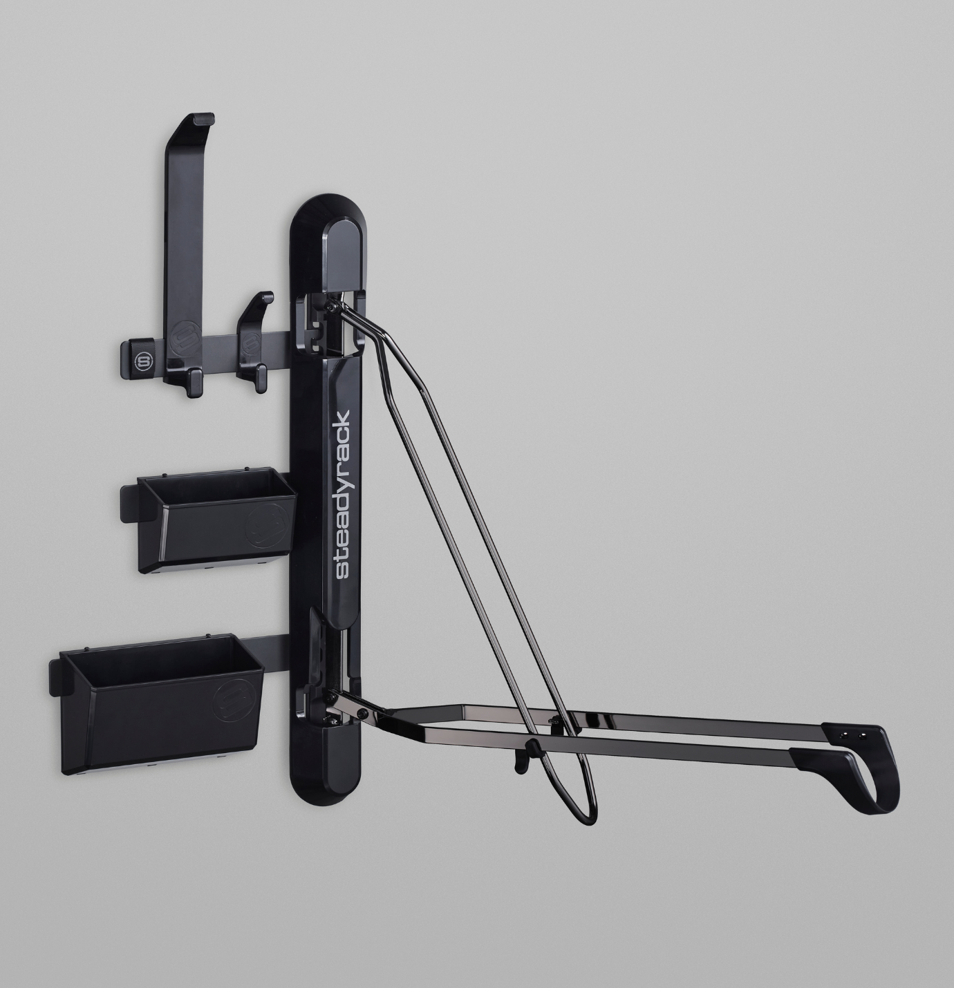 The Steadyrack Team have spent the last eighteen months perfecting our new product to ensure it was flawless. It was trial and error: concepts were created, prototypes tested, designs refined, and more concepts were created, and more prototypes tested - you get the idea. With a sleek combination of hooks, bins, and adjustable straps, GearMate lets you arrange your accessories your way. Fully customisable with over 200 arrangements, it adapts to suit your setup and style. Designed to install seamlessly behind your Steadyrack, its sturdy spine supports brackets to hold all your essentials.